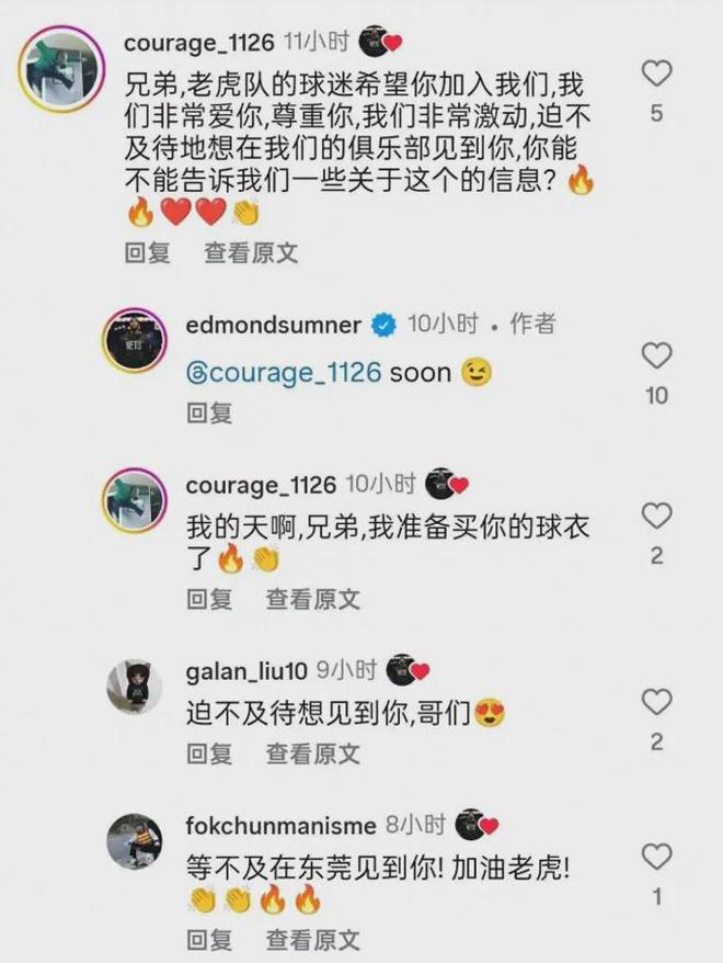 后者活跃在社交媒体,在本周有球迷继续询问萨纳姆希望你可以加入我们华南虎,萨纳姆本人则回应:很快!这个夏天萨纳姆就曾亲自发声接近加盟广东男篮,后续他本人删除了这条动态。