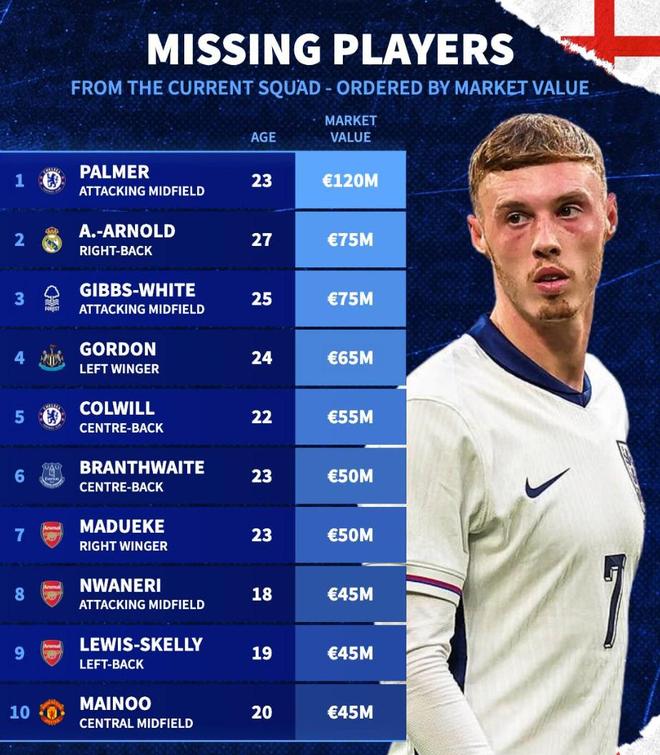 此次未入选英格兰队身价前10:帕尔默、阿诺德前2,梅努在列