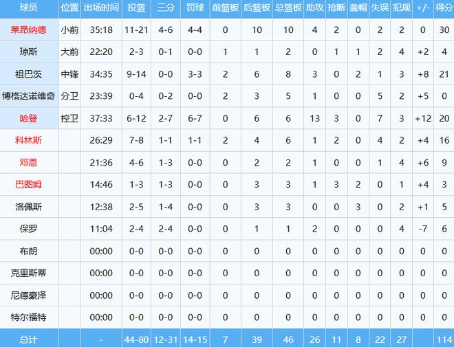 本场开拓者全队数据如下: