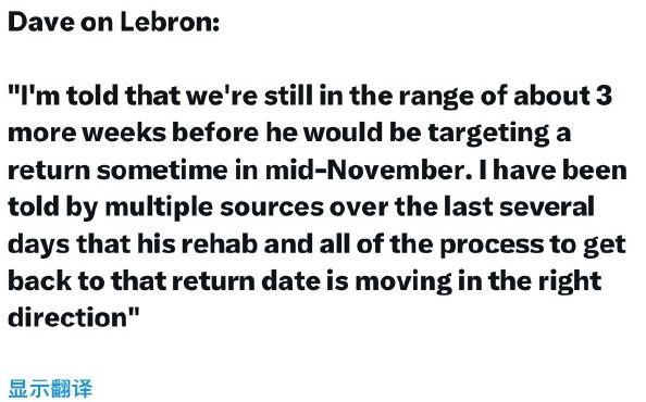 10月28日,根据记者Dave McMenamin消息,詹姆斯依旧需要三周时间才能复出,大概在11月中旬回到赛场。