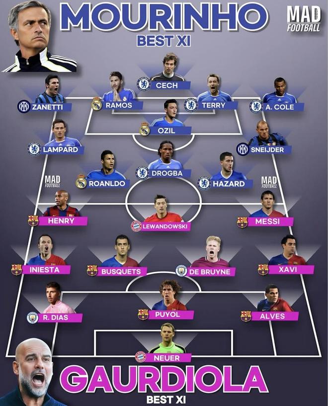 近日,MAD FOOTBALL 盘点了穆里尼奥与瓜迪奥拉执教生涯的“最佳11人”阵容:穆帅阵容有 C罗、德罗巴、兰帕德等球员上榜;瓜帅阵容有梅西、伊涅斯塔、德布劳内等球员上榜。您认同下面的阵容吗?