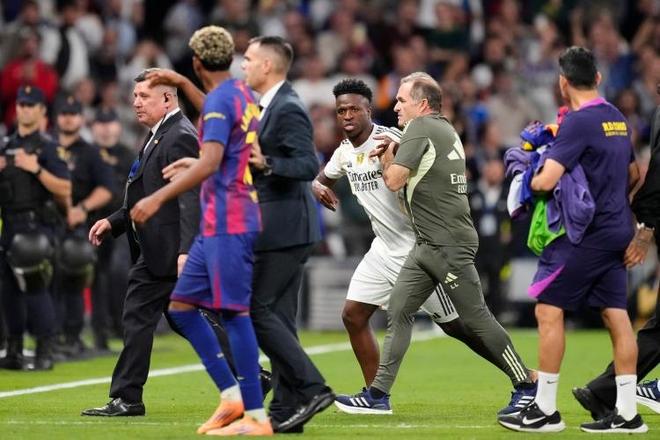 亚马尔在安保人员的护送下走下了场边,这时候维尼修斯从一旁过来,和亚马尔说了几句什么。
